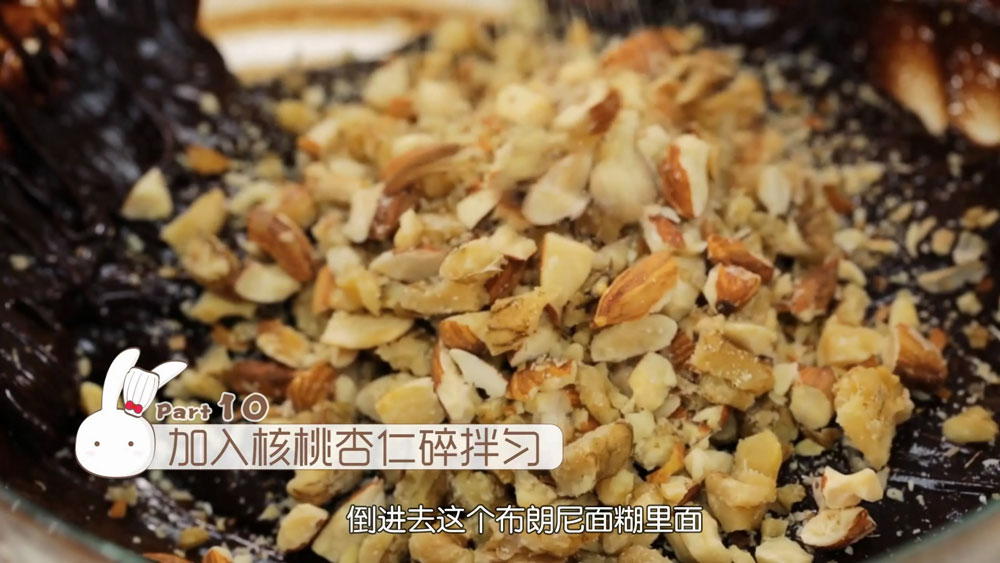 12 05:56接着要把敲碎的杏仁和核桃倒入布朗尼面糊中用刮刀混合均匀;