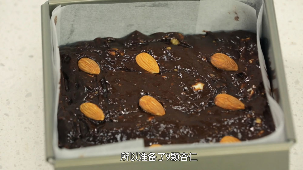 13 06:35模具铺上油纸(视频有教如何剪油纸),把布朗尼面糊倒入模具中铺平,然后放上整颗的杏仁和杏仁碎,面糊就做好了;