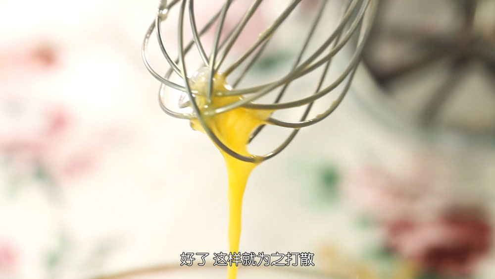 4 02:48打散的鸡蛋,让蛋清散开不结块就可以了,再把步骤2的面糊慢慢倒入鸡蛋里,一边搅拌一边倒入;