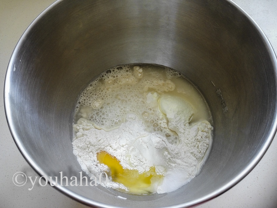 1、 除黄油外的所有材料放入搅拌缸中,以慢速~中速~快速搅拌15分钟(如果没有厨师机也可以参考手工揉面发酵步骤)
