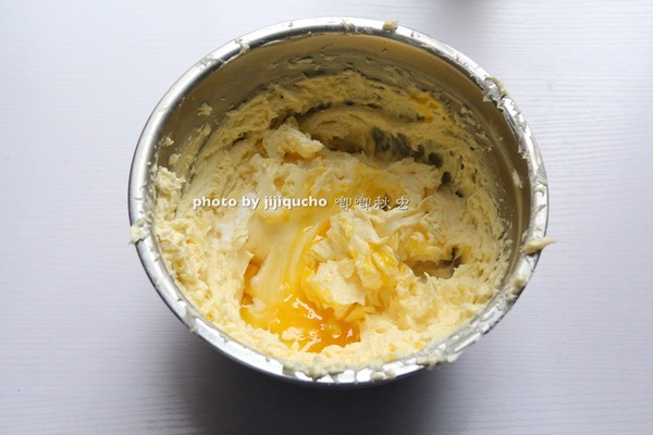 1.准备好原料,黄油切小块软化,用电动打蛋器把黄油打至半膨发
