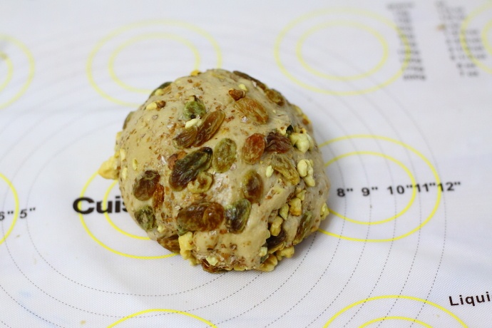 6、将核桃仁、葡萄干与面团揉均匀