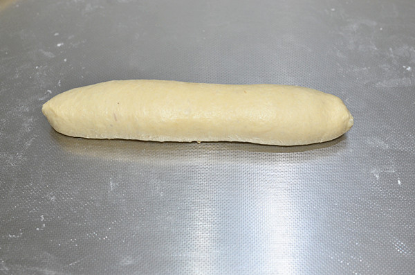 面包材料:高筋面粉500g,细砂糖70g,盐7.5g,奶粉60g,全蛋液50g,牛奶50g,冰水75g,香蕉泥150g,黄油50g,即发干酵母5g。