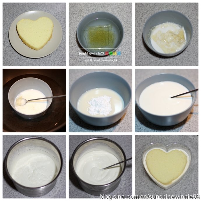 6寸慕斯原料:蛋糕一片 淡奶油250克 糖粉25克(加入淡奶油中) 酸奶220克牛奶30克吉利丁2片半(5克/片)糖粉25克(加入酸奶中)