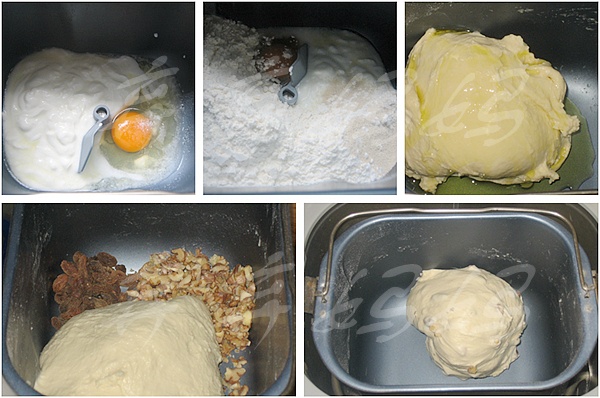 3、再次启动“普通面包”程序搅面10分钟后,加入核桃仁和葡萄干混合均匀后,中断程序,基础发酵;