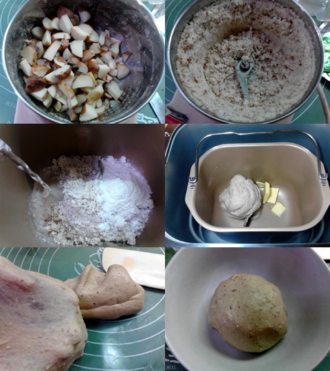 面团:熟菠萝蜜核65克,高筋粉90克,全麦粉30克,盐1/4小勺,糖15克,黄油15克,干酵母2克,奶粉20克,水80克