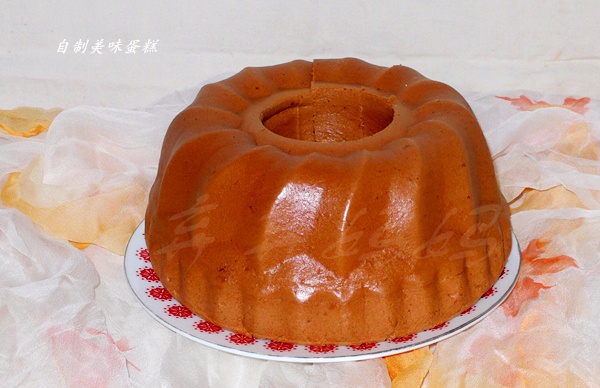 8、时间到,取出模具扔到台面上(就是将模具摔一下),再将模具倒扣在烤网上,自然晾凉后脱模切件;