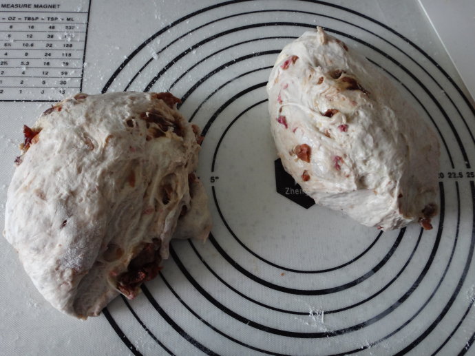 主面团材料:全部中种面团/高筋粉(王后硬红高筋粉)197g/麦芽精1.8g/水145g/低糖速发干酵母0.8g/核桃粉37g/荔枝干80g/玫瑰干花瓣0.4g/玫瑰酒11g