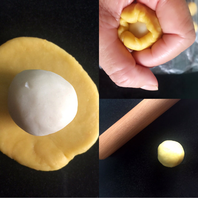 3,油皮面团分割成18克一个的小圆球,擀平成圆形,包进一个油酥小球。