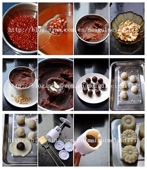 1、红豆要提前浸泡一夜,煮至面软,捞出,加入红糖,用勺子捻成红豆馅。