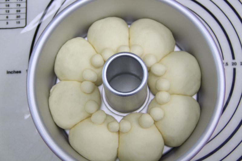 7、把小面团放入中空戚风模具里,进行2发,温度35度,湿度70%-80%。