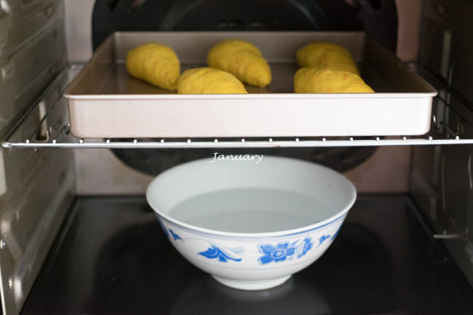 10、在烤箱里放入一碗温水,面团进行二次发酵;