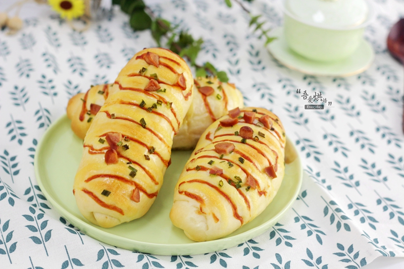 在面包表面加了香葱,沙拉和火腿粒,看起来更加诱人,而且是有淡淡的咸香味,不腻,作为早餐的不二选择