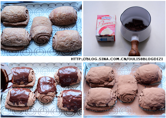 7、50克淡奶油加热,放入40克巧克力加热融化,倒在烤好的酥皮包上,最后撒上可可粉即可