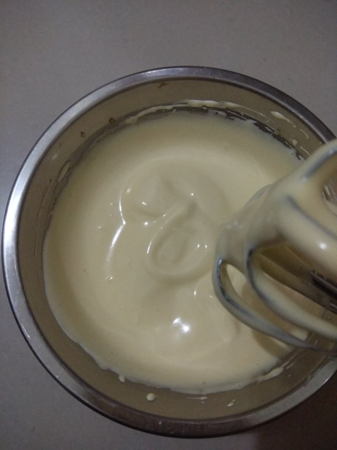 2、 用打蛋器高速打发,提起打蛋器,蛋液划8字,花纹不会立马消失,如图示。