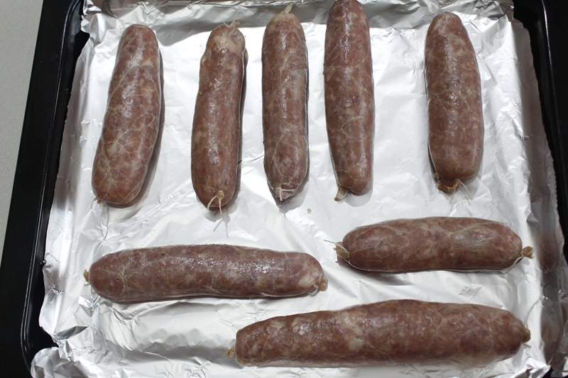 10、烤盘上铺上上锡纸,刷上一层油,把香肠放在锡纸上。