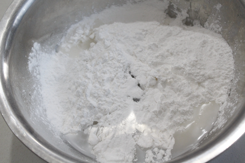 7、再来制作面团部分,开水加入土豆淀粉,进行和面。