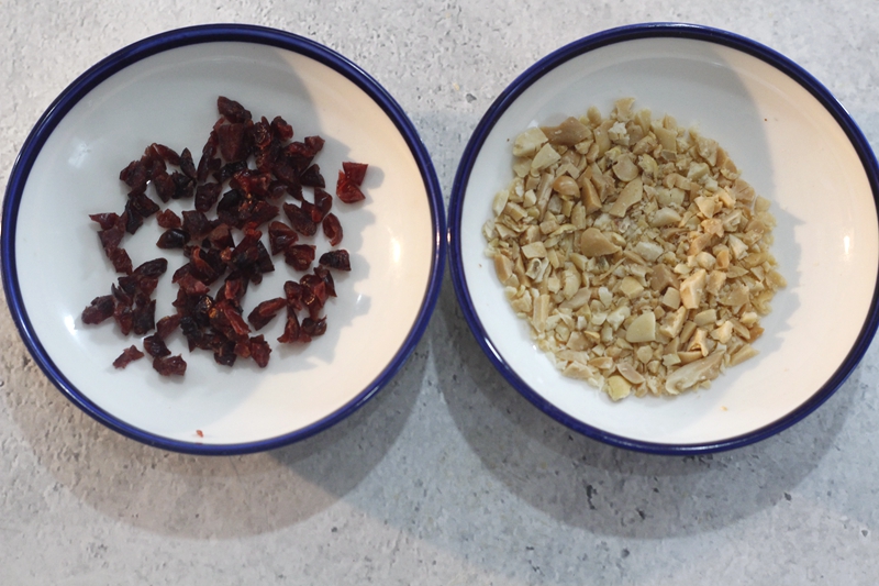 装饰:牛奶巧克力50克,黑巧克力50克,蔓越莓干适量,杏仁碎适量