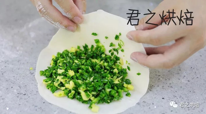 10、将韭菜鸡蛋馅放在面皮中间,然后将面皮折叠,将韭菜鸡蛋馅包在中间。