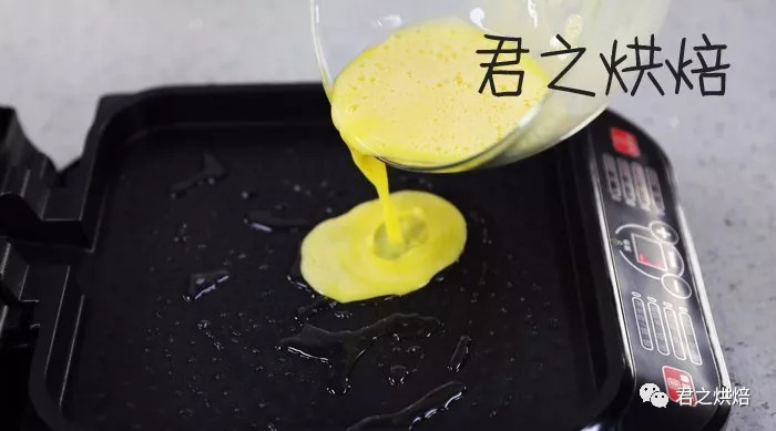 1、两个鸡蛋倒入大碗里充分打散。平底锅烧热或将电饼铛下盘预热好以后,倒入少许植物油。然后倒入打散的鸡蛋,将鸡蛋炒熟。