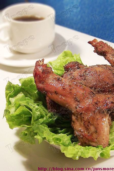 配料:兔肉250克(最好是兔腿部分),牛至叶1小勺,百里香1小勺,迷迭香1小勺,罗勒1小勺,白胡椒粉1小勺,(都是1小勺,就表示可以随意哈。按自己口味搭酌情增减吧),海盐适量,红酒一大勺,蜂蜜适量