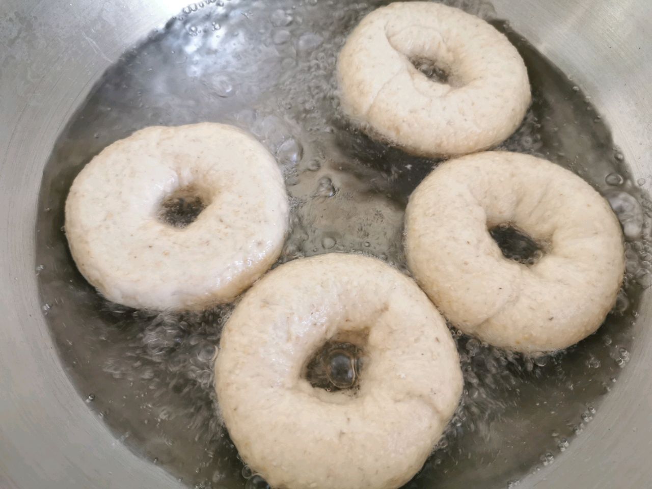 高筋面粉300g,即食燕麦100g,酵母3g,盐3g,糖10g,黄油8g,牛奶310g, 煮贝果用的水 1000L, 煮贝果用的糖 50g