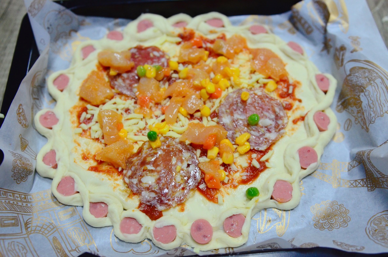 普通面粉(披萨饼底) 300克, 温水(披萨饼底) 230毫升, 食用盐(披萨饼底) 1茶匙, 酵母(披萨饼底) 7克, 白糖(披萨饼底) 1茶匙,橄榄油35克, 披萨馅料 , 蕃茄酱(披萨专用) 4汤匙,芝士碎大量, 萨拉米肠 4片, 鸡胸肉(提前腌制) 100克, 玉米粒青豆 适量,海鲜菇1小把,小番茄3个,火腿肠1根,橄榄油15克,现磨黑胡椒适量