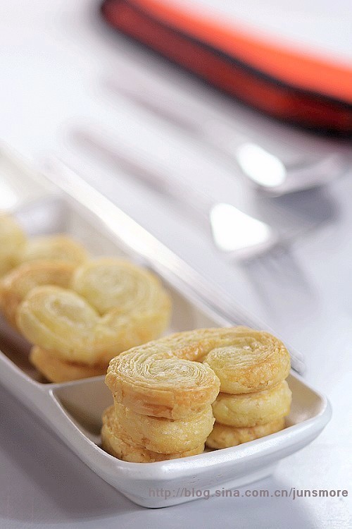 3、在烘焙的过程中,千层酥皮会膨胀开来,蝴蝶酥的体积会变大,所以烤盘上每个蝴蝶酥之间需要留有一定的间隔。