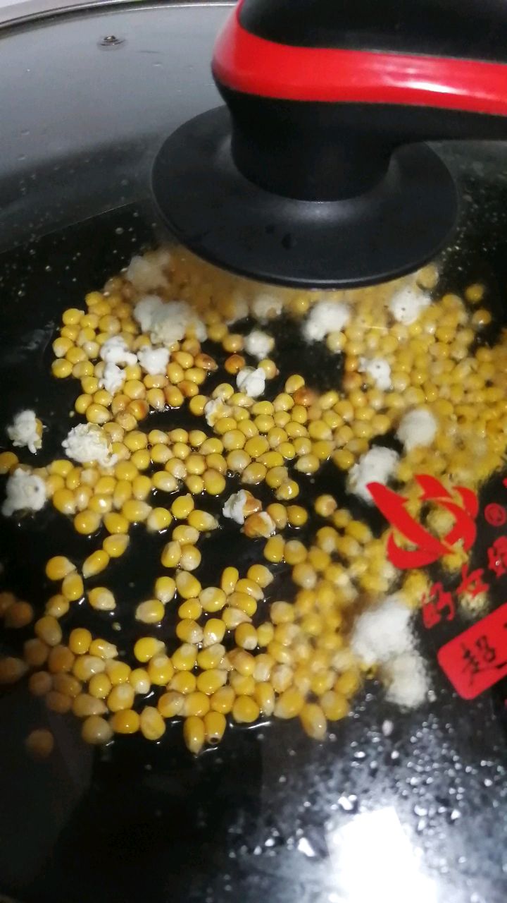 步骤4:等到差不多都崩开了,锅内没有啪啪声,打开锅盖,翻炒一分钟,散散水汽,会更脆