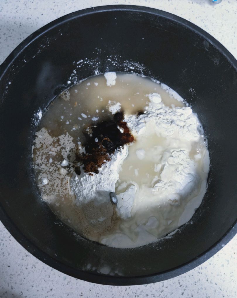 步骤1:中筋面粉500克,白糖10克,红糖120克,酵母,5克,泡打粉5克,放到和面机里启动和面程序混合成面团。如果手揉的话,先把面粉和白糖,红糖,泡打粉混合,再把酵母放到温水里融化,放到混合好的面粉里和成光滑的面团。揉成团后醒面10分钟后,再揉面就光滑了。