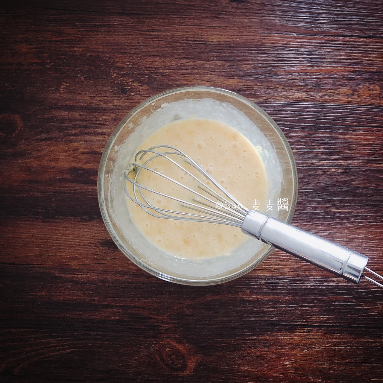 步骤2:香蕉泥+25g全蛋液+15g炼乳+15g糖+20g玉米油倒入碗中