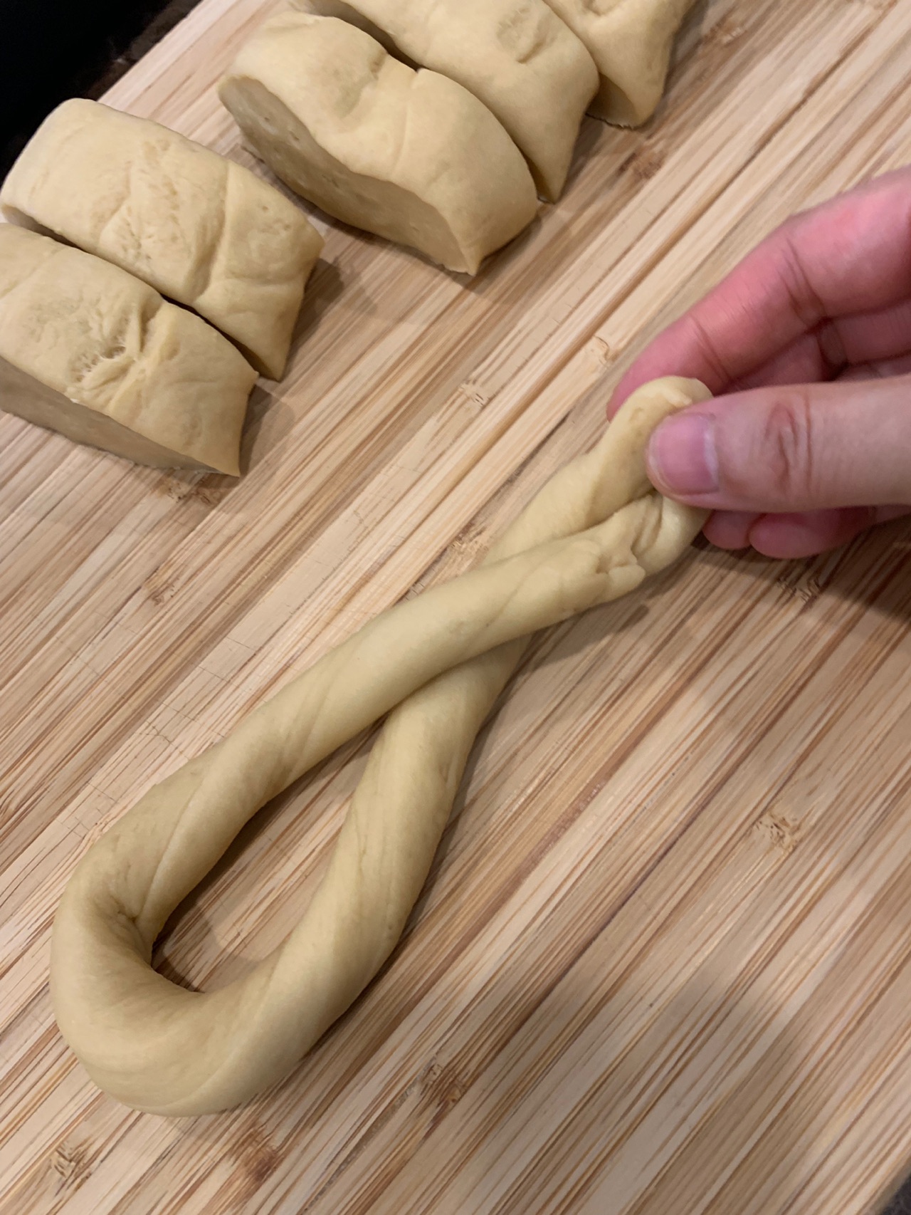 步骤7:长条两边逆时针上劲,然后把两个头放一起