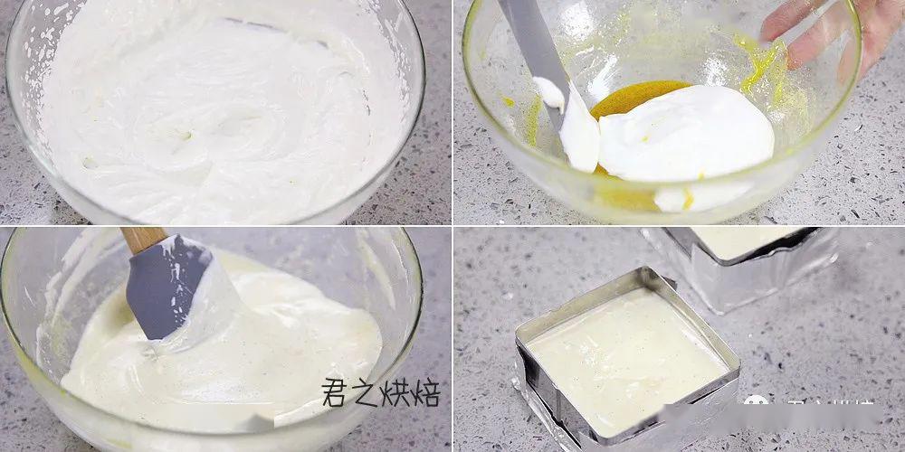 将芭菲液倒入用锡纸包好底部的方形慕斯圈里(我用的是两个4英寸的方形慕斯圈)。放入冰箱冷冻室(冻冰的那一层,-18℃),冷冻过夜,直到完全冻硬。