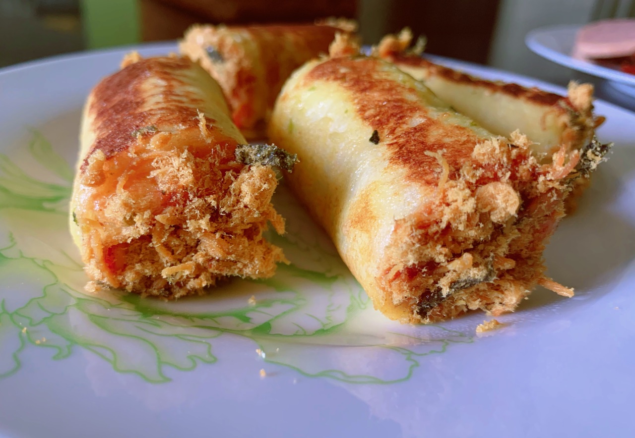 吐司海苔肉松,熟芝麻火腿肠,番茄沙司鸡蛋
