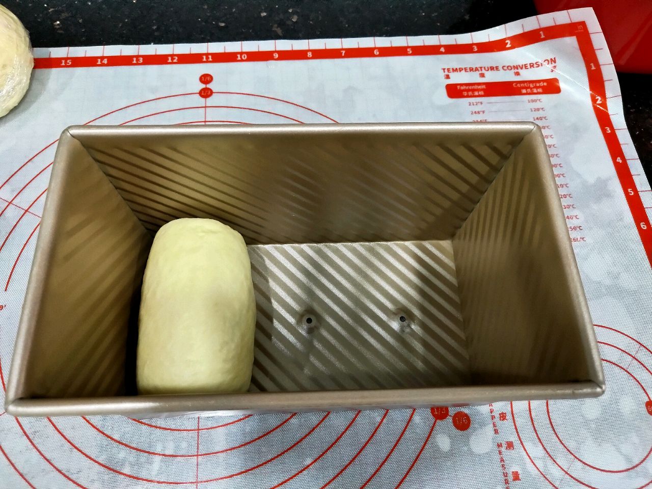 步骤15:发到8分满的时候,拿出来。然后先预热烤箱,150度10分钟。然后盖上土司盒盖子,把土司盒放入预热好的烤箱中层,150度烤20分钟,然后转125度烤20分钟。温度高低要看自家烤箱,我家烤箱温度偏高,所以需要中途调一下温度。
