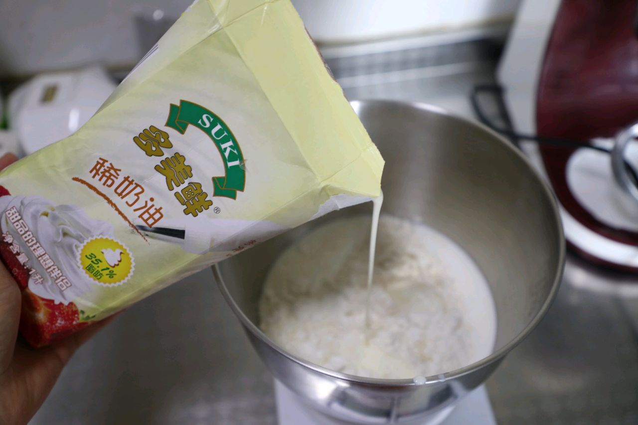 步骤2:将面粉,酵母粉,盐,糖和牛奶按配方,依次放入厨师机的大盆内,再加入100克的淡奶油。