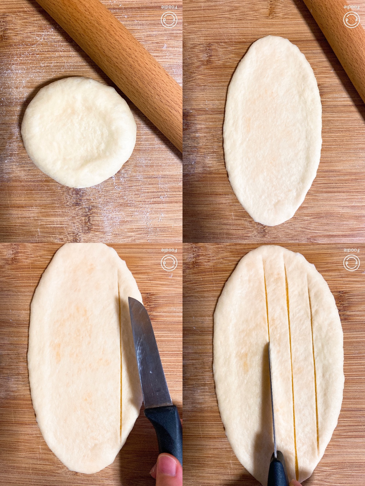 步骤10:用手压扁,用擀面杖擀成长条,准备一把刀,用刀尖在擀好的面团上划出几条刀痕,只要表面划破即可。