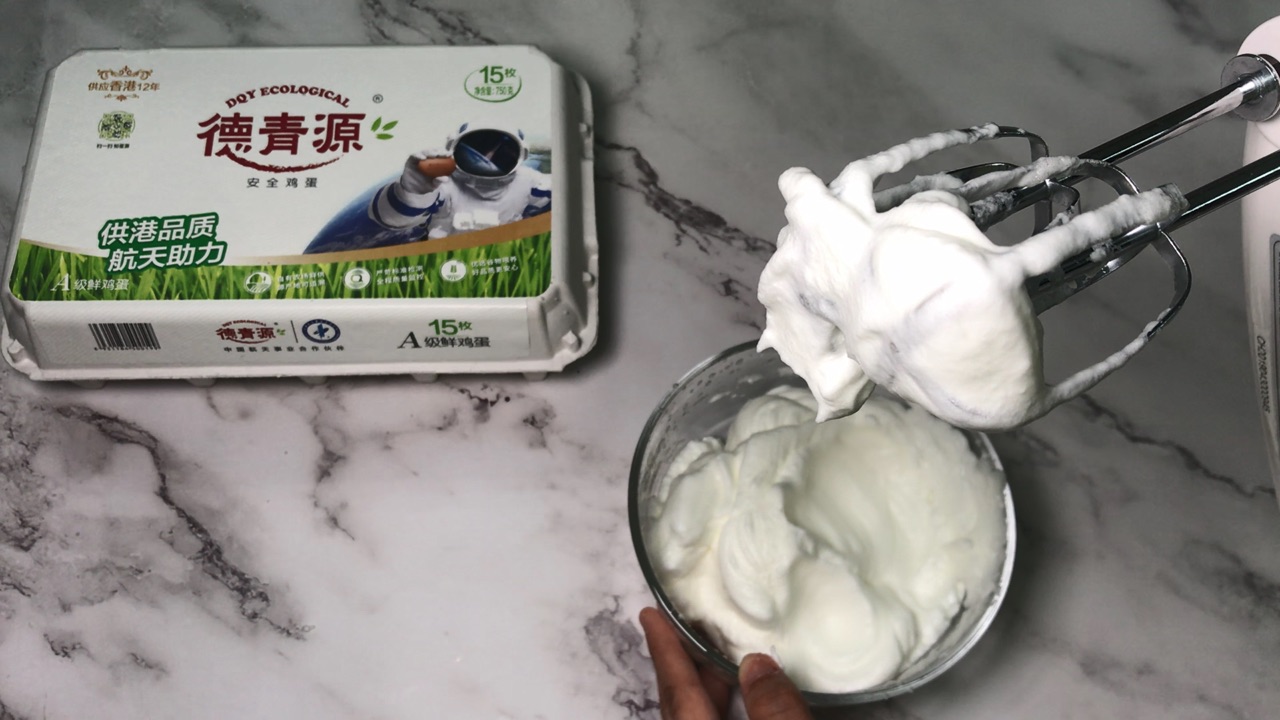步骤3:将蛋白液打发至硬性发泡(打蛋器提起后有小尖勾)。