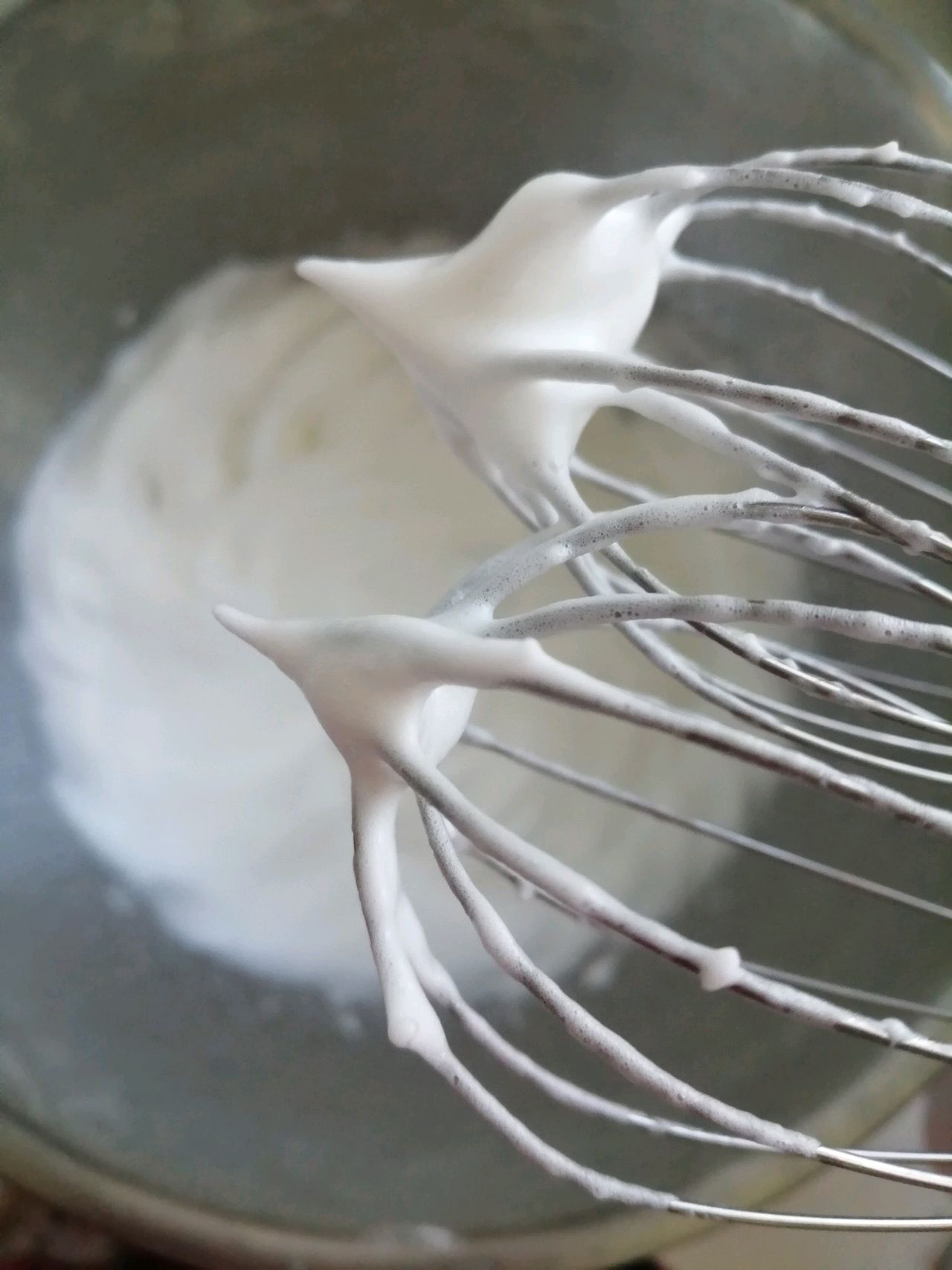 步骤9:再来放大看看打发好的蛋白的状态,快速提起打蛋器,蛋白有小尖角,就是这样的状态就可以。蛋白打发好以后,记得去预热烤箱,90度一个小时,不要忘记,因为溶豆挤好以后最好马上进烤箱。