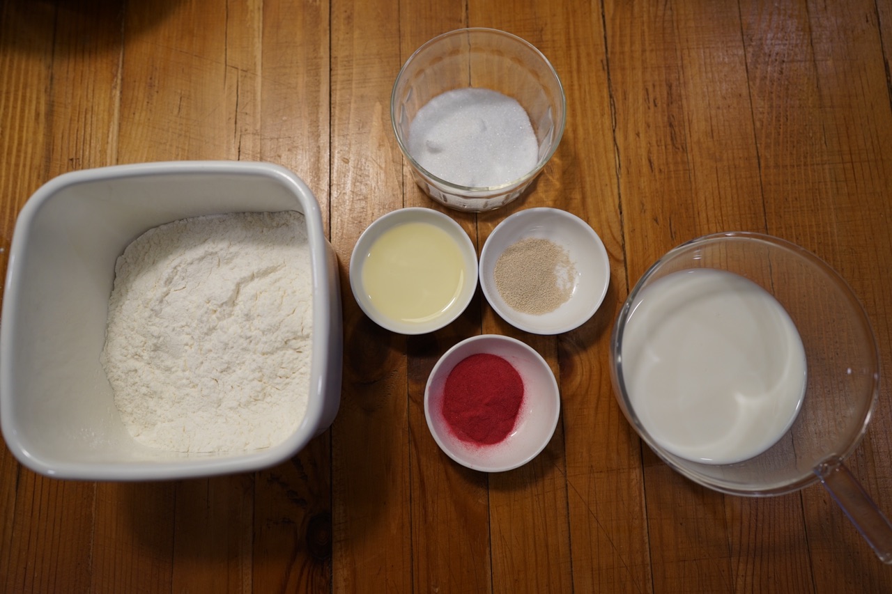 中筋面粉250克,牛奶110克,酵母2克,糖10克,椰子油5克, 仙人掌果粉(红曲粉) 2克,豆沙130克