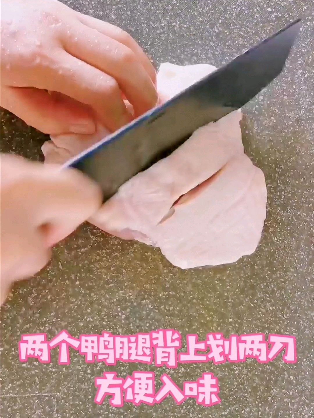 步骤1:鸭腿洗干净表上划刀方便入味切姜片放到鸭腿中去腥