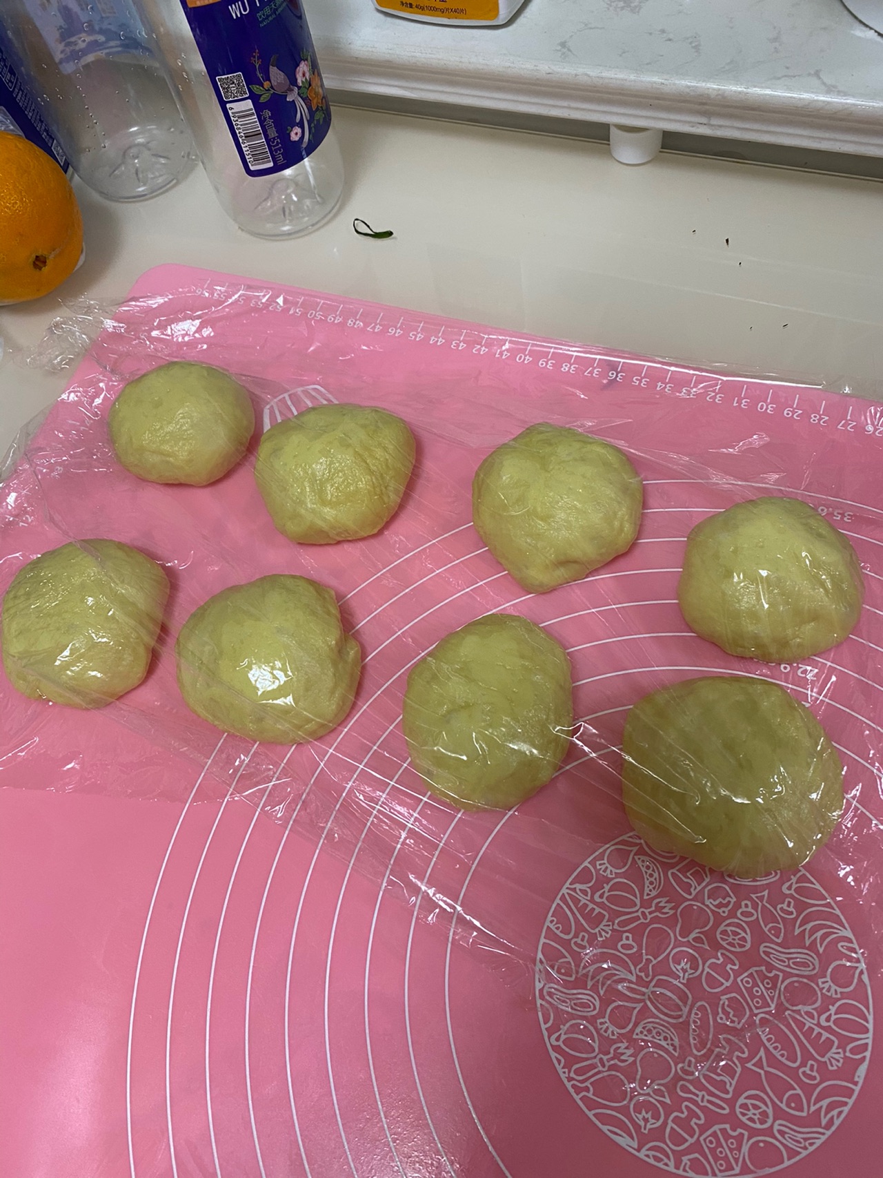 步骤9:然后把面团分成8个小剂子,保鲜膜覆盖,静置10分钟,这样面包会更松软
