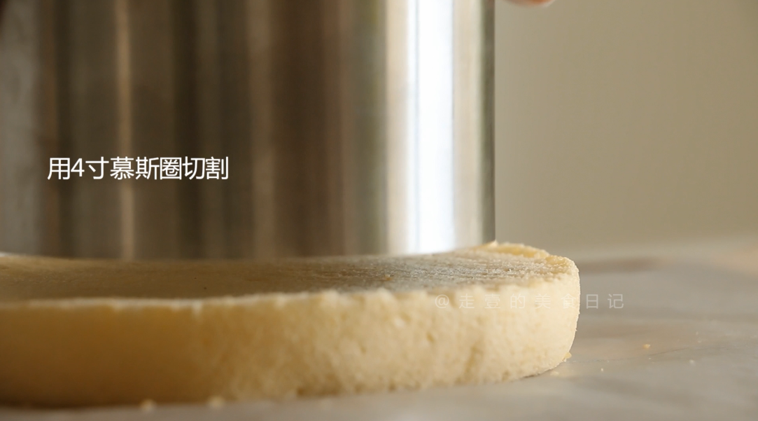 步骤1:Step 1:4寸蛋糕胚1制作6寸圆模戚风,分割两层,用4寸慕斯模具切割成所需大小。2将4寸慕斯模放在平盘上,放入蛋糕片,一旁备用。