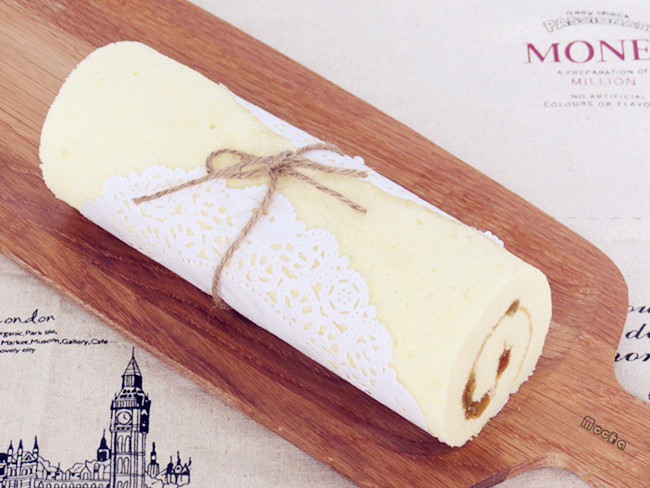 11、在蛋糕卷开始的地方用刀划三道痕印(不要划断,这样比较好卷),抹上芒果果酱,撒上葡萄干